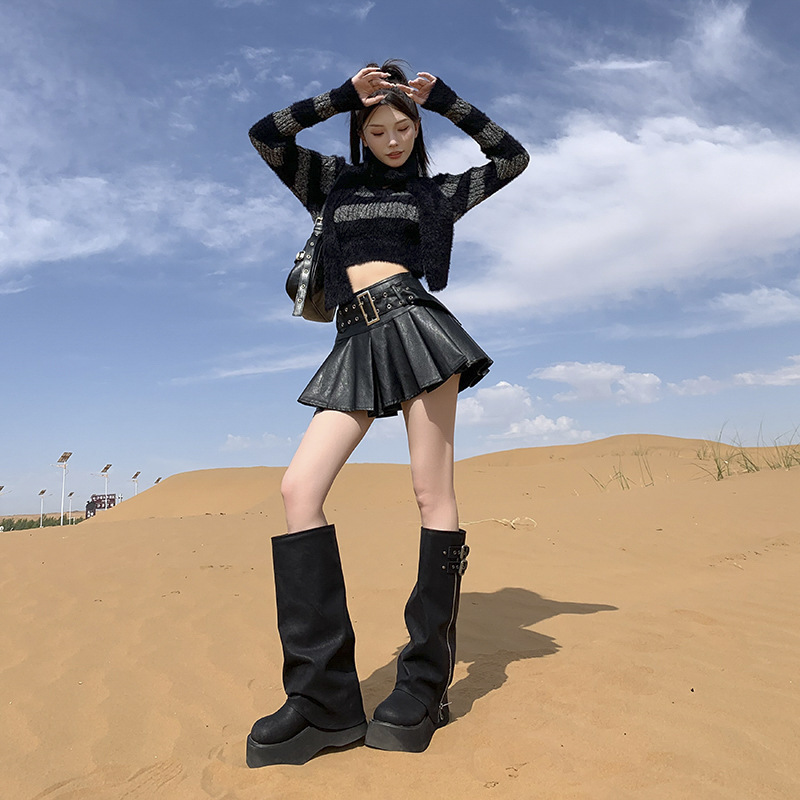合皮素材で仕立てた黒ミニスカート。裾に施されたプリーツデザインとサイドスリットが、洗練された印象を与えます。スタイリッシュさと可愛らしさを兼ね備えたこのスカートは、様々なコーディネートにスムーズに馴染む一着。季節を問わず、デイリールックに華を添える頼れるアイテムです。